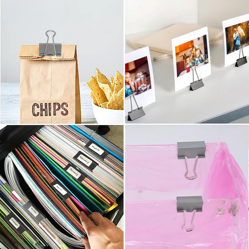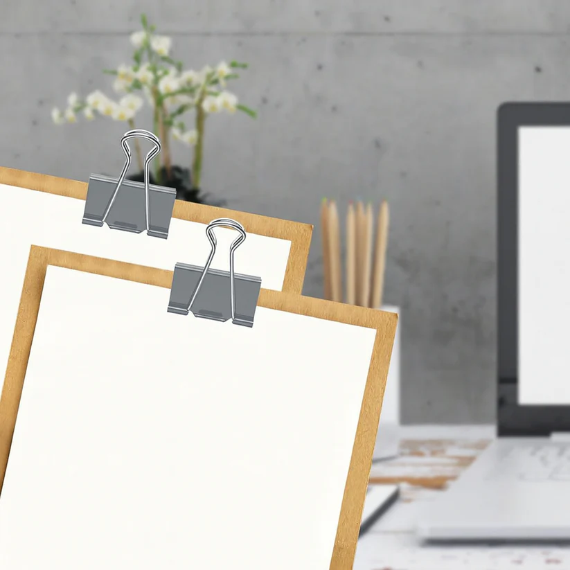 Keep papers neat and together with this durable metal binder clip. The foldback design grips a thick stack firmly without tearing sheets, while the high-tension spring steel handles open smoothly and fold down flat to save space in files and folders. Tough, rust-resistant plating and a chip-resistant color finish make it ideal for everyday office use—and it’s reusable for years. Beyond paperwork, use it to seal snack bags, route charging cables, hang photos/labels and more.