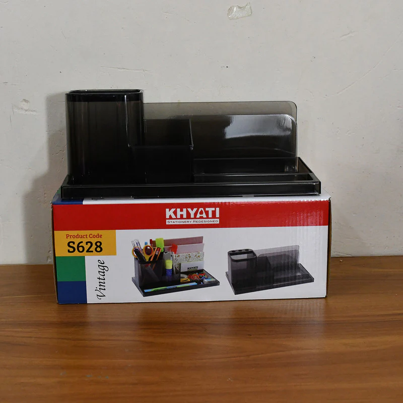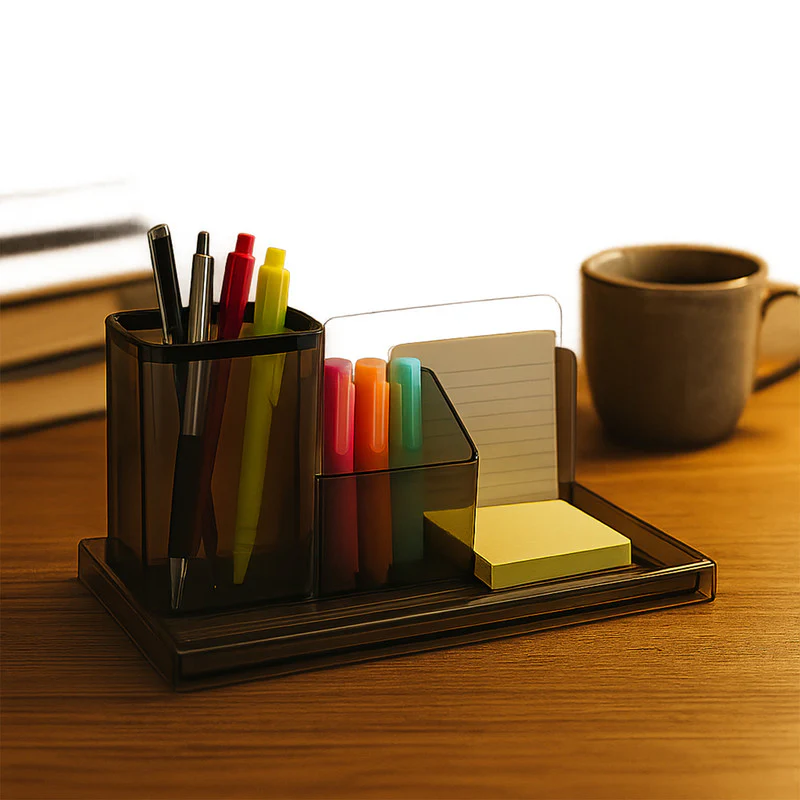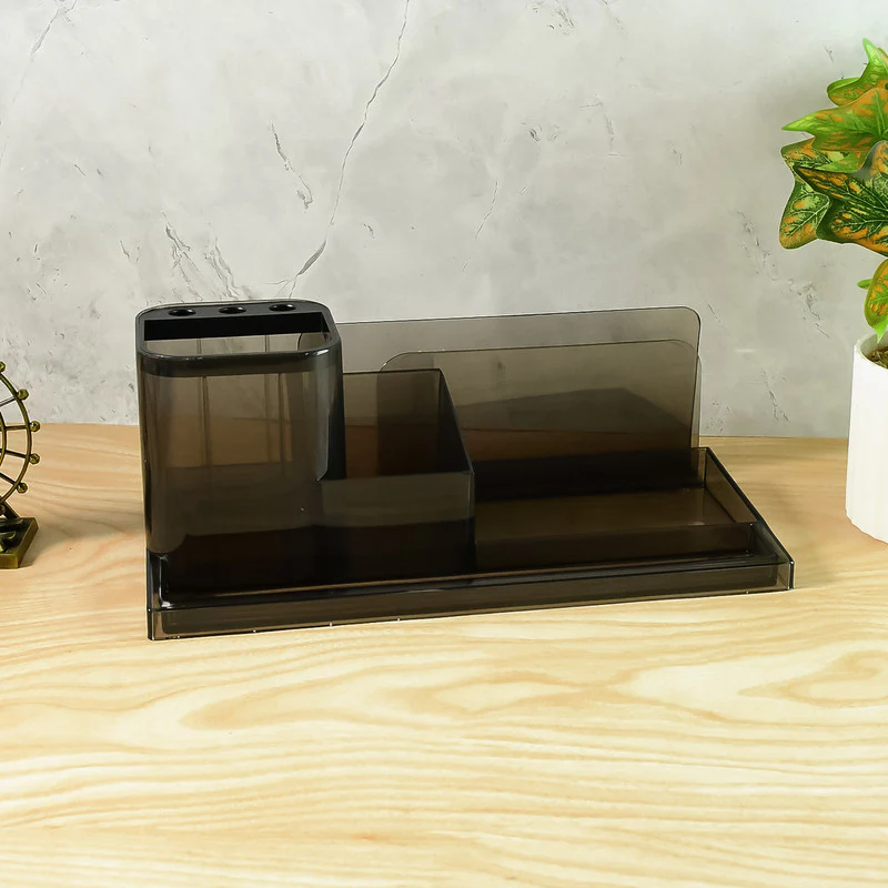 The Khyati Desk Organizer is designed to bring both elegance and efficiency to your workspace. Crafted in a sophisticated smoke-grey finish, it features a clear and structured layout that keeps your essentials neatly arranged. With thoughtfully designed compartments, it allows you to store pens, markers, notes, envelopes, and small accessories in one organized unit. Its sturdy base ensures stability, while the transparent build offers a modern, refined look that suits both professional and creative environments. A blend of simplicity and functionality, this desk organizer makes everyday work effortless and organized.